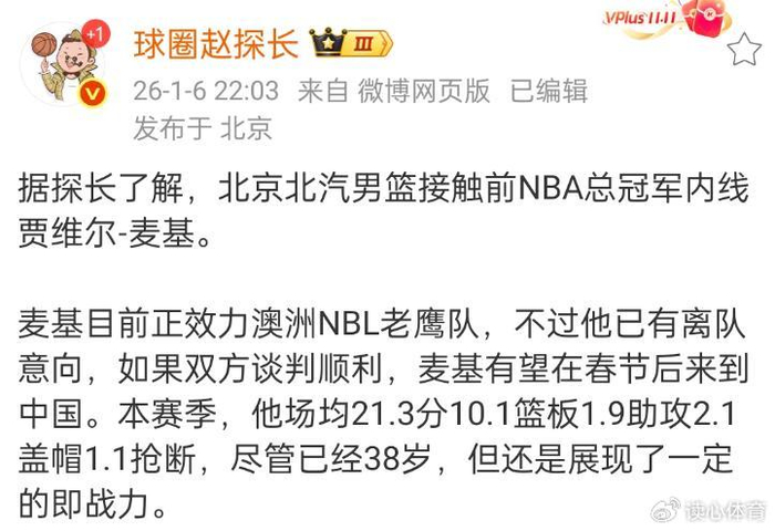 据多位权威媒体人透露,在裁掉水货外援奥莫特后,北京首钢连续出手引援,先下签下了1米93后卫维克托-贝利,而后又与此前在湖人、勇士等多支NBA球队效力过的中锋贾维尔-麦基基本谈妥了薪资待遇,不过麦基要春节过后才能加盟球队,预计马蒂昂将继续打完第1阶段剩余比赛。如此一来,北京首钢的野心早已公之于众,就是要趁着周琦、赵睿尚在巅峰期,全力争冠。维克托-贝利此前在欧洲联赛效力,擅长组织串联,三分球命中率也维持在四成左右,贾维尔-麦基目前在澳洲NBL球队效力,护框能力犹在,但已38岁,年龄确实有些偏大。